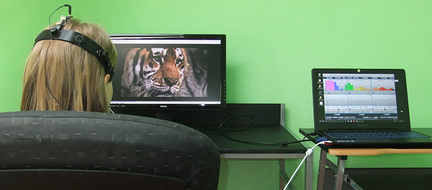 Mittels am Kopf angebrachter Elektroden werden die Hirnaktivitäten auf einem Monitor sichtbar gemacht.